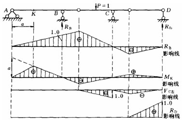 用静力法作静定多跨梁的影响线,首先区分基本部分和附属部分。由于单位集中力在基本部分移动时,对附属部分无影响,故按照前述单跨静定梁影响线的作法就可作出附属部分的影响线。作基本部分的影响线时,要分两种情况考虑:当单位集中力在基本部分移动时,仍可按前述单跨静定梁影响线的作法作其影响线;当单位集中力在附属部分移动时,由分析可知,基本部分某量值的影响线为直线,此直线可以根据铰接处影响线的竖标值为已知,以及在附属部分的支座处,该量值影响线为零的特点作出。用此法作出的图5—2所示静定多跨梁的影响线,如图5—2所示。