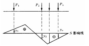 图5—5表示一组位置、数值都已知的集中荷载及某量值S影响线。根据影响线的概念及叠加原理,该集中荷载组产生的量值S为