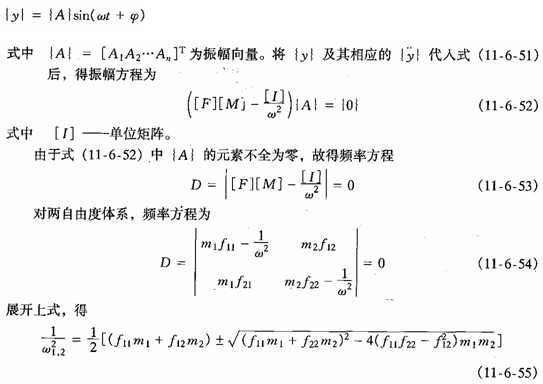 解频率方程( 11-6-53 ) ,可得 n 个自振频率ω k ( k = 1 、 2 、…、 n ) ,若按它们的数值由小到大依次排列,则分别称为第一、第二、… 第 n 频率,总称为体系自由振动的频谱,其中第一频率you称为基频。