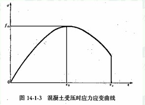 图14-1-3所示混凝土受压时应力应变曲线的特征,是研究钢筋混凝土构件的强度、变形、延性和受力全过程分析的依据。一般取棱柱体试件来测试混凝土的应力应变曲线,整个曲线呈上升段与下降段两个部分。曲线中最大应力值f ck、与f ck 相应的应变值ε0、以及破坏时的极限应变值εu 是曲线的三个特征值。应变ε0的平均值一般取为 2 .0×10-3 。 对于非均匀受压的情况,εu值约为 0.002 一 0.006 .甚至达到 0.008 或更高。
