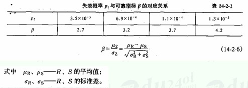用失效概率度量结构构件的可靠度,概念合理,意义明确,但在计算上较繁,可以用与失效概率有相应关系的可靠指标β来度量,见表 14-2-1 。