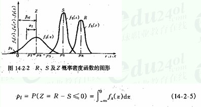 结构构件的可靠指标应该很据基本变量的平均值、标准差及其概率分布类型进行计算。如果功能函数中的基本变量 R 、 S 均为正态分布,而且极限状态是线性的,则R、 S、 Z的概率密度函数图形示如图 14-2-2 , 则图中纵坐标左面以pf 表示的面积即为失效概率pf ,即