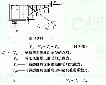 配有箍筋和弯起钢筋的简支梁,当发生剪压破坏时,其受剪承载力是由剪压区混凝十承受的剪力Vc、斜截面上骨料咬合力Va的竖向分力、纵筋的销栓作用Vd、箍筋所承受的剪力 Vs以及弯起钢筋承受的剪力Vsb等几部分所组成的。然而,目前还难于精确地分别算出各部分的数值。因而,《规范 》 用半理论半经验的方法解决受剪承载力的计算问题。取临界斜裂缝左边一段构件为隔离体(图 14-3-10 ) ,为了计算简便,不考虑斜截面上骨料咬合力及纵筋的销栓作用,则斜截面总的受剪承载力 Vu由三部分组成,即
