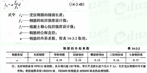 当简支梁在其支座处出现斜裂缝后,该处的纵筋拉应力将增大,此时,如纵筋的锚固长度不足,将使梁发生在支座处的粘结锚固破坏,为此 《 规范 》 规定:当计算中充分利用钢筋的抗拉强度时,受拉钢筋的锚固长度应按下式计算: