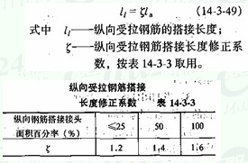 纵向受拉钢筋绑扎搭接接头的搭接长度应根据位于同一连接区段(连接区段的长度为 1.3 倍搭接长度)内的钢筋搭接接头面积百分率(是指在同一连接范围内,有搭接接头的受力钢筋与全部受力钢筋截面面积的百分比值)按下式计算: