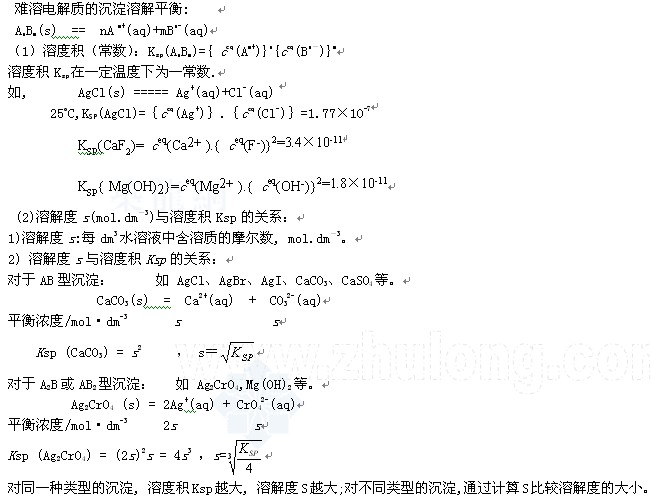 若 Q Q=KSP ,饱和溶液,沉淀和溶解达到平衡; Q>KSP ,过饱和溶液,有沉淀析出 如,在FeS的饱和溶液中,Q=KSP ,加入盐酸后,由于S2-+2H+=H2S(g),降低S2-浓度,使Q 注意: 1) Q为任意状态溶液离子浓度如起始浓度以计量系数为指数的乘积; 2)若有几种沉淀,先满足Q=KSP者,先沉淀; 3)沉淀完全(离子浓度<10-6) 不等于离子全部沉淀. (4)同离子效应:在难溶电解质溶液中,加入与难溶电解质具有相同离子的易溶电解质,可使难溶电解质溶解度降低,这种现象叫做同离子效应。 环球网校友情提示:如果您在此过程中遇到任何疑问,请登录环球网校结构工程师考试论坛,随时与广大考生朋友们一起交流! 编辑推荐: