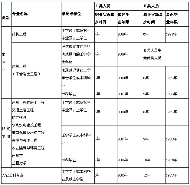 注:表中“Ⅰ类人员”指基础考试已经通过,继续报考专业考试的人员;“Ⅱ类人员”指符合免基础考试条件只参加专业考试的人员,该类人员可一直报考专业考试,直至通过为止。