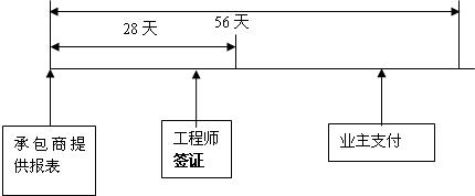 (4)业主支付。承包商的报表经过工程师认可并签发工程进度款的支付证书后,业主应在接到证书后及时给承包商付款。业主的付款时间不应超过工程师收到承包商的月进度付款申请单后的56天。如果逾期支付将承担延期付款的违约责任,延期付款的利息按银行贷款利率加3%计算。