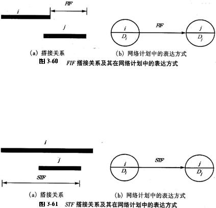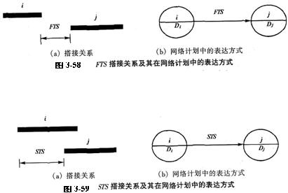 从结束到开始的搭接关系如下图3—58(a)所示,这种搭接关系在网络计划中的表达方式如图3—58(b)所示。
