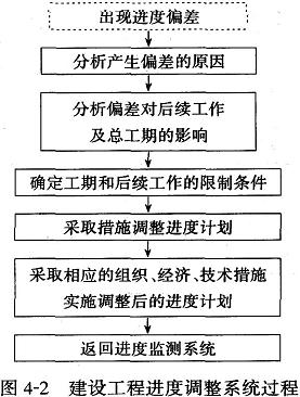 在建设工程实施进度监测过程中,一旦发现实际进度偏离计划进度,即出现进度偏差时,必须认真分析产生偏差的原因及其对后续工作和总工期的影响,必要时采取合理、有效的进度计划调整措施,确保进度总目标的实现。进度调整的系统过程如图4—2所示。
