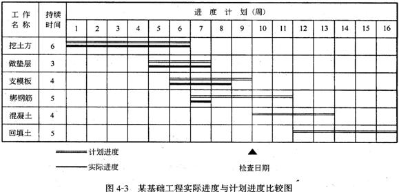 例如某工程项目基础工程的计划进度和截止到第9周末的实际进度如图4—3所示,其中双线条表示该工程计划进度,粗实线表示实际进度。从图中实际进度与计划进度的比较可以看出,到第9周末进行实际进度检查时,挖土方和做垫层两项工作已经完成;支模板按计划也应该完成,但实际只完成75%,任务量拖欠25%;绑扎钢筋按计划应该完成60%,而实际只完成20%,任务量拖欠40%。