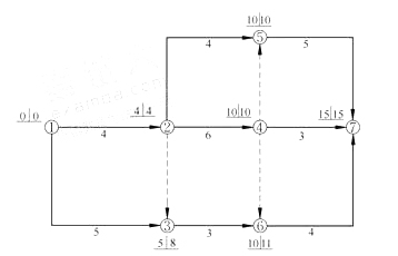 5.某工程双代号网络计划如右图所示,图中已标出每个节点的最早时间和最迟时间,该计划表明( )。