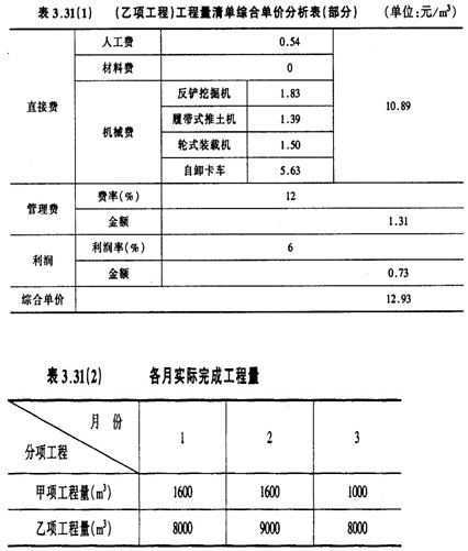 合同工期内,承包商每月实际完成并经工程师签证确认的工程量如表3.31(2)所示。