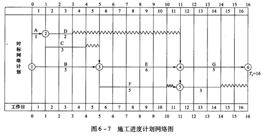 某6层住宅楼工程项目时标网络计划如图6 -7所示,在工作日第5天下班后检查施工进度完成情况,发现A工作已完成,D工作尚未开始,C工作进行2天,B工作进行3天。