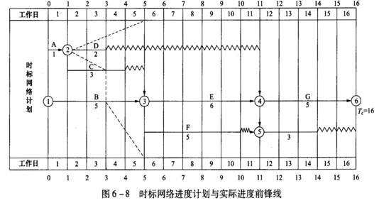 答案:绘制实际进度前锋线(如图6-8中虚线所示)(10分)。