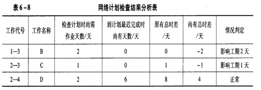 答案:网络计划检查结果分析见表6-8(10分)。