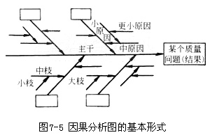 构成――从图7-5可见,因果分析图由质量特性(即质量结果指某个质量问题)、要因(产生质量问题的主要原因)、枝干(指一系列箭线表示不同层次的原因)、主干(指较粗的直接指向质量结果的水平箭线)等所组成