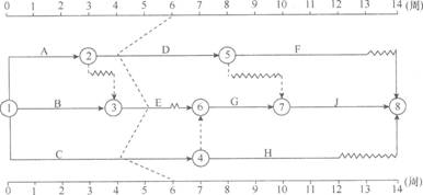 115.某工程项目时标网络计划如下图所示,根据第6周末实际进度的检查结果绘制前锋线,