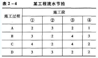 某工程由4个施工过程组成,分为4个施工段进行流水施工,其流水节拍(天)见下表2―4,则施工过程A与B、B与c、C与D之间的流水步距分别为( )。