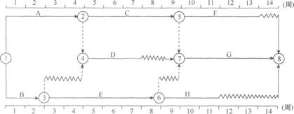68.某工程双代号时标网络计划如下图所示。如果B、D、G三项工作共用一台施工机械,而且必须顺序施工,则在不影响总工期的前提下,该施工机械在现场的最小闲置时间是