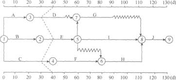 70.某工程项目双代号时标网络计划如图所示,在计划执行到第40天下班时刻检查时,其实际进度如图前锋线所示,则下列说法错误的是( )。