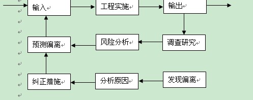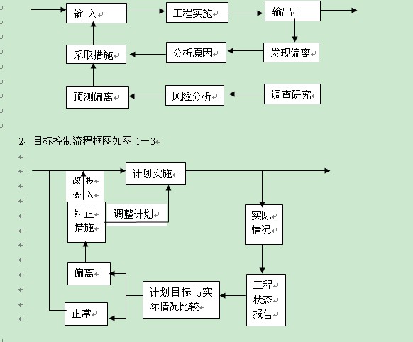 2.在充分了解被动控制的循环过程闭合回路流程图的基础上进一步细化,即可绘出目标控制流程框图。细化时主要是将实施的实际结果与计划目标相比较,比较结果可能出现二种情况:一种是呆发生偏离;另一种是发生了偏离。前者属于正常情况,可继续按原计划执行;后者是不正常情况,应采取措施纠正。而纠正的措施又有两种途径,一是调整计划,二是改变投入的资源。