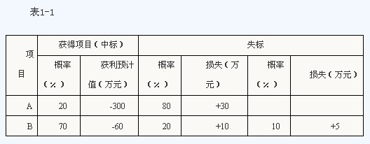 某工程承包公司有两个施工招标项目可供选择:其中工程项目A为某个国家的大型国际会议中心项目,预计合同额较高,如能中标可获得较高利润,但竞争对手多而强,失标的风险较大,且投标所耗费用高;另一工程项目B为一般公用建筑,如中标可获利润相对较少,竞争对手少,自己有优势,中标的可能性较大,投标所需费用相对较少。它们各自的中标概率、失标概率及相应的获利额和投标费用损失(失标损失)额如表1―1所示。