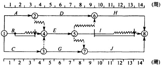 在所示双代号时标网络计划中,如果B、D、I三项工作共用一台施工机械且必须顺序施工,则总工期( )。