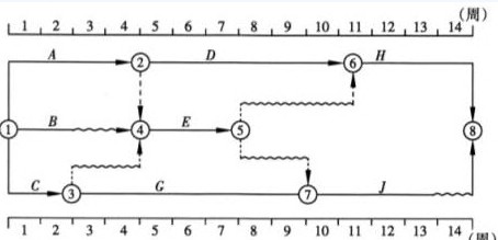 在下图所示双代号时标网络计划中,如果C、E、H三项工作因共用一台施工机械而必须顺序施工,则该施工机械在现场的最小闲置时间为( )周。