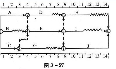 某工程双代号时标网络计划如下图所示,其中工作日的总时差和自由时差( )。