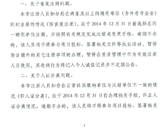关于本市建设工程注册人员重复注册、人证分离等有关问题的处理通知