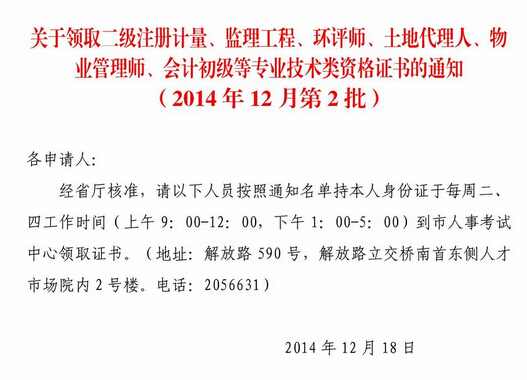蚌阜监理工程师资格证书领取通知(2014年12月第2批)