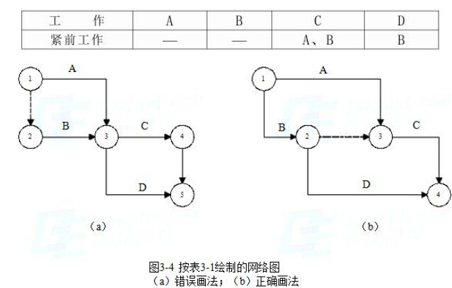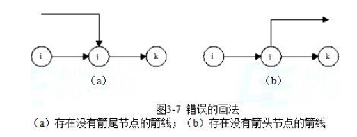 (5)网络图中严禁出现没有箭尾节点的箭线和没有箭头节点的箭线。图3-7即为错误的画法。