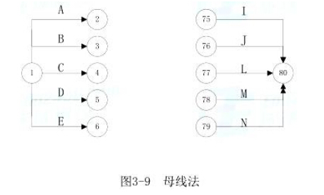 但当网络图的起点节点有多条箭线引出(外向箭线)或终点节点有多条箭线引入(内向箭线)时,为使图形简洁,可用母线法绘图。