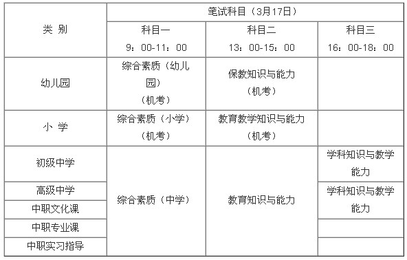 教师资格考试分笔试和面试两个部分,笔试各科成绩合格者方可参加面试。笔试采用机考或纸笔考试方式,幼儿园和小学类别考试科目采用机考方式,其它类别考试科目采用纸笔考试方式。面试采用结构化面试、情景模拟等方法,通过备课、试讲、答辩等方式进行。