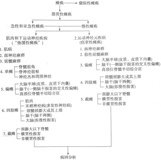(2)器质性瘫痪确定后,可根据瘫痪的分布的部位和范围以及瘫痪的其他特点,考虑进一步定位诊断:肌源性瘫痪、下运动神经元瘫痪还是上运动神经元瘫痪。见图23。