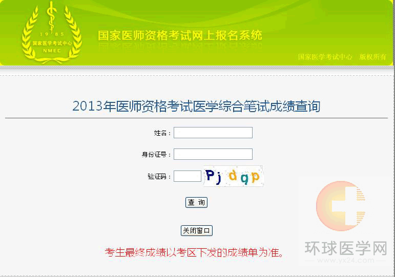 2013年临床执业医师资格考试医学综合笔试成绩已经出来了,还未查成绩的考生可以登录国家医学考试网(http://www.nmec.org.cn/)或者点击下面图片链接进行成绩查询。
