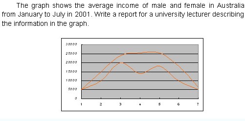 三、文章中出现的句式。在小作文评分中,句子结构是重要考察项。中国考生往往因为母语的影响,对运用不同句式作文掌握还有所欠缺。特别是在描写曲线时,很多曲线在不同阶段有相似的走势,在描述的过程中,更加应该注意尽量避免同种句式频繁出现。如要表示男性人均收入在1月到3月中上升很快,我们可以说:Average income for male workers in Australia increased greatly from January to March in 2001. 也可以用名词来表示:There was a great increase for average income for male workers from January to March in 2001。类似的表达还有很多,考生们可以在备考的过程中加以总结归纳。