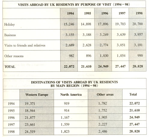 The two tables reflect the results of a survey which sampled a cross-section of 100,000 British people over a span of four years from 1994 to 1998. The first one shows the purposes of their visits abroad and the second indicates their choices of destinations.