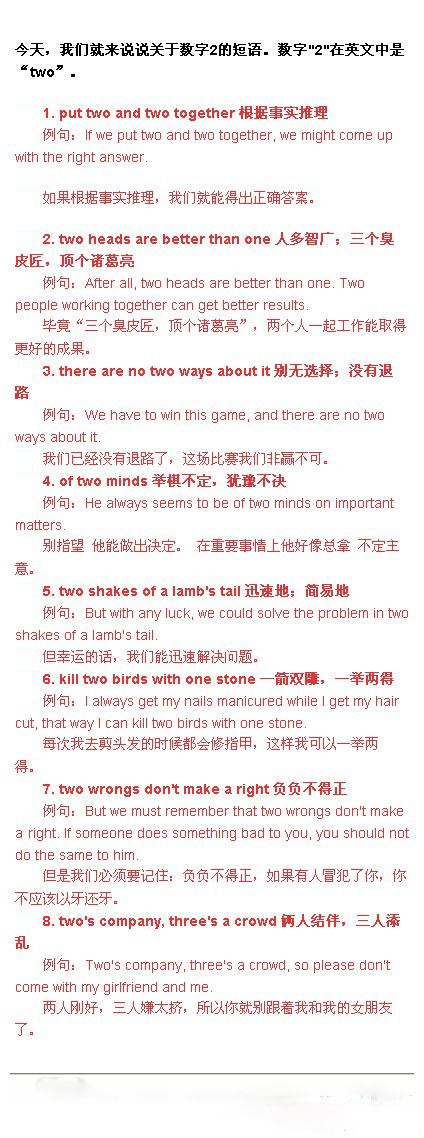 4. Two heads are better than one. 人多智广;三个臭皮匠,顶个诸葛亮。
