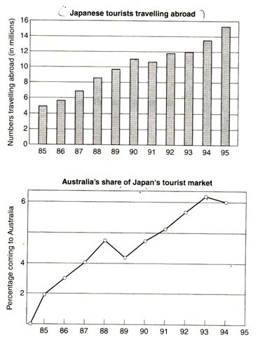 The chart below shows the number of Japanese tourists traveling abroad between 1985 and 1995 and the graph reveals Australia's share of the Japanese tourist market.