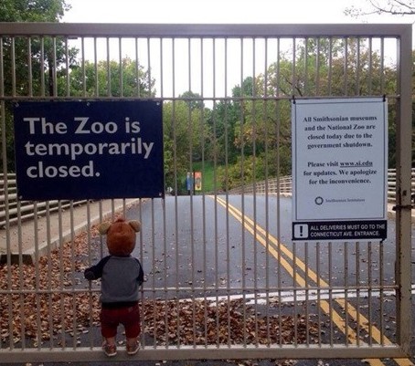照片里的小男孩儿,背对着镜头站在国家动物园的大铁门外,门上贴着一个通知,“动物园暂时闭馆”。这张图片已经成为网上最受喜爱的照片之一。它被称为“美国政府关闭的讽刺景象”,人们纷纷谴责美国政府闭馆让孩子们失望了。