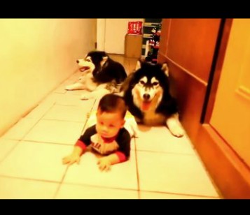 A YouTube video of two Alaskan malamute dogs mimicking a crawling baby as he makes his way up the hallway of his home has been rated as "too cute," so be careful as not to keep watching this if you're still at work and not prone to smiling on the job.