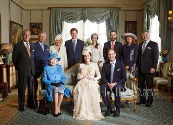 簇拥在凯特王妃身边的是其余的皇室成员:尽管已经92岁高龄而且近来身体欠佳,却仍显得神采焕发的菲利普亲王、小王子的祖父母查尔斯王储和康沃尔公爵夫人、和一脸溺爱神情的哈里王子叔叔。
