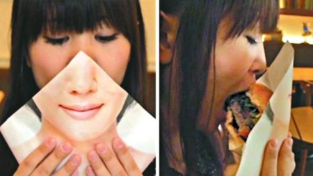The Liberation Wrapper is a paper 'napkin' which holds the burger and covers the mouth with a picture of a polite smile as you take a bite.