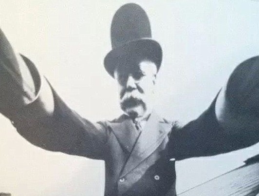 在这张标有时间的自拍照上,拜伦?克莱顿先生就是那位戴着眼镜、蓄着胡须的绅士。照片上的拜伦?克莱顿先生面带微笑地举着照相机,和他的朋友们一起,穿着得体的西装,戴着圆顶礼帽。