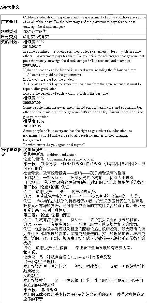 本次小作文为表格题,数据较多,有一定难度。本次大作文题目为政府、教育类题目,与2013年8月17日写作题目有一定的相似度,但去年题目注重在大学教育费用,本次是children’s education。大家要注意的不要写跑题。