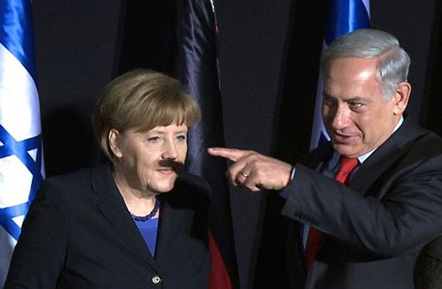 Israeli prime minister Benjamin Netanyahu has been caught on camera unintentionally pointing his finger to form a shadow looking like a ‘Hitler moustache’ on German chancellor Angela Merkel’s face.