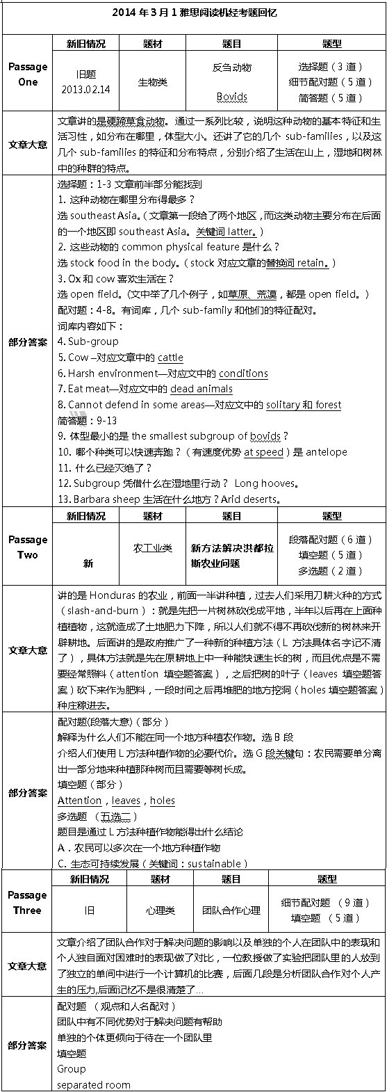 总体来讲,本次阅读难度适中,题材皆为旧题。其中,passage one是生物类,重复2013年2月14日原题;passage two属于老树新枝,类似原来考过的非洲农业话题,但有新观点新角度;passage three属于心理类文章。本次雅思阅读考试涉及到的题型有Matching,Summary,List of headings,Multiple choices, short answer questions。其中Summary和Matching比重比较大。建议烤鸭们平时多练习高频题型。