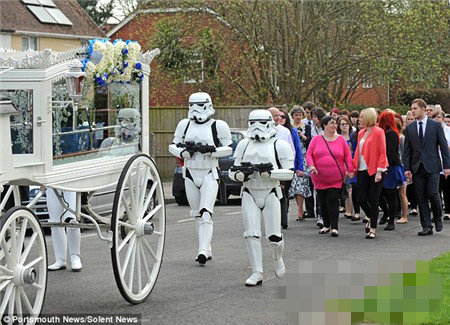 他的父母特伦斯和玛丽决定为儿子庆祝生命和激情,他们把儿子的遗体放在星球大战主题的棺椁里,白马拉车,“克隆人士兵” 护卫。